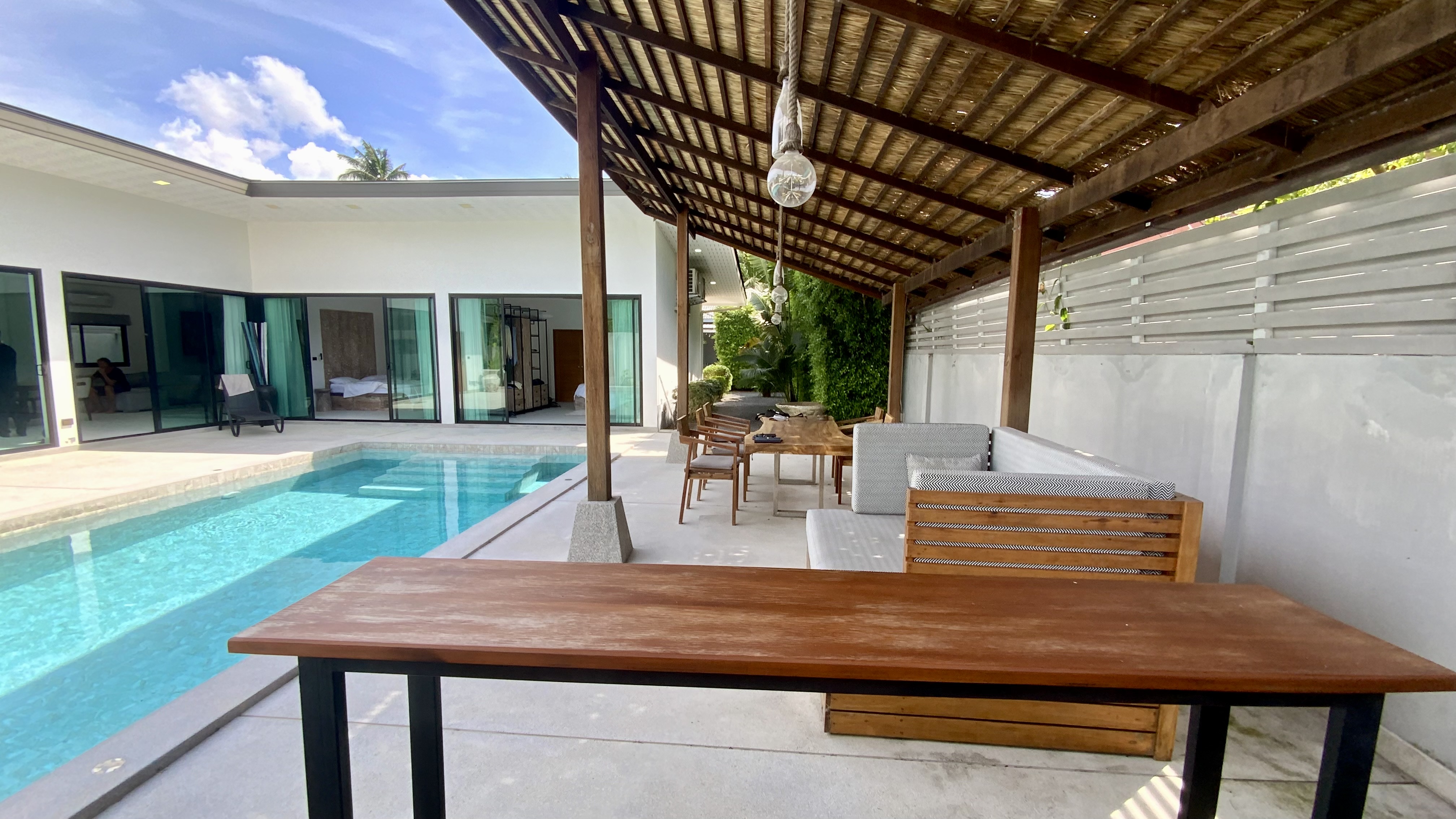 charmante villa de plein pied d’environ 120m2 composée d’une grande pièce de vie d’environ 80 m2 avec cuisine ouverte sur le séjour / salle à manger, deux suites, buanderie, parking privé et jardin paysager et clos avec terrasses autour d’une magnifique piscine de 10x4 m. Vendue en pleine propriété et entièrement meublée.